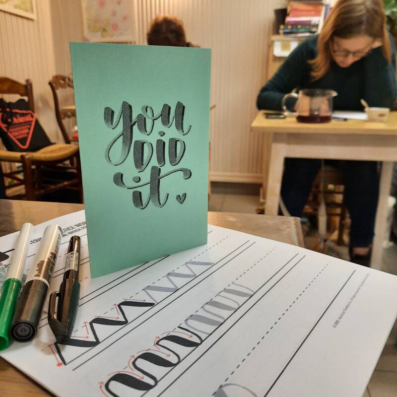 Deze workshop is redelijk technisch. Een groot deel van de tijd gaat naar het onder de knie krijgen van de techniek om met brushpennen te letteren waardoor je in één vloeiende beweging die mooie overgang krijgt tussen dunne en dikke lijnen. Door daarop te focussen ervaren de deelnemers dikwijls rust.