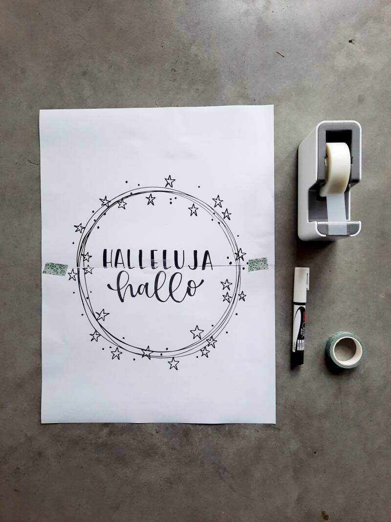 Print het op ware grootte (A4) of een beetje groter (A3-gebruikte ik voor op mijn glazen voordeur). Als je het ontwerp groter wil dan A4, kies dan voor poster printen of op meerdere pagina’s afdrukken zodat het ontwerp uit meerdere vellen bestaat.