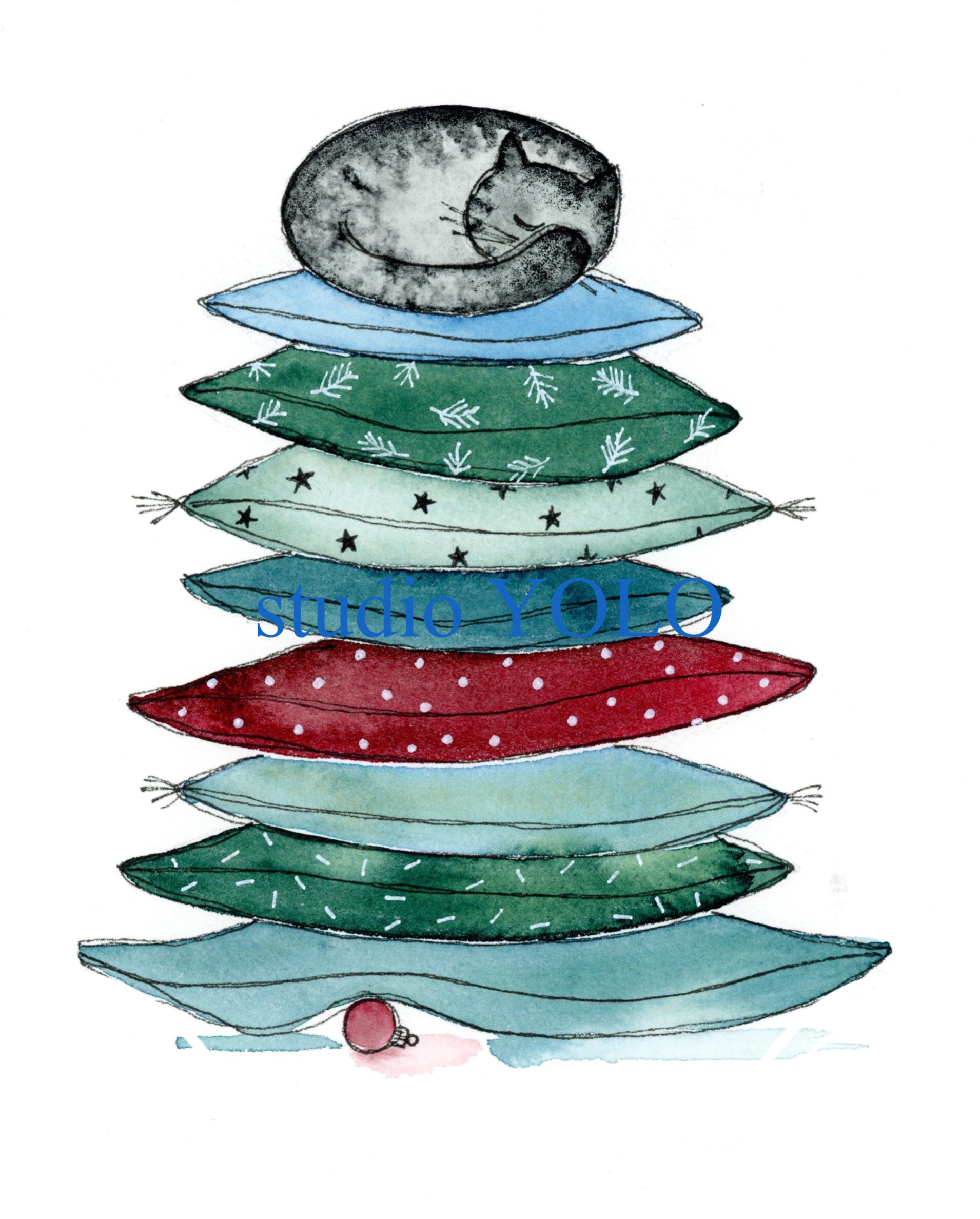 Zo is het idee voor deze illustratie ontstaan. De kussens stapelde ik met een beetje goede wil in de vorm van een kerstboom en de erwt werd een kerstbal. Het is een kaartje geworden om iemand een zacht jaar toe te wensen. Omdat de wereld wat zachter en gevoeliger mag worden.