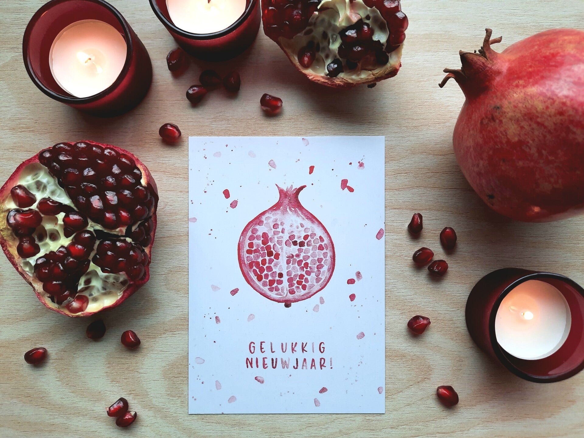 3x "gelukkig nieuwjaar - granaatappel" omdat die granaatappel symbool staat voor geluk en voorspoed. De vele pitjes staan voor veel goeds en het rood van de granaatappel voor een warm hart.